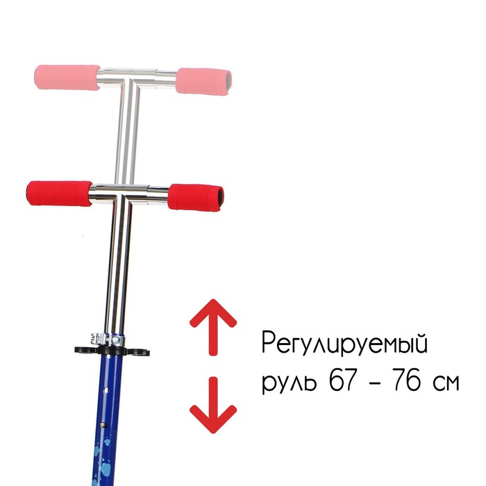 Платформа с шероховатым покрытием предотвращает скольжение ног. Высота руля регулируется и фиксируется в трёх положениях. Рама складывается: рулевая стойка опускается к деке. В таком положении самокат занимает мало места.