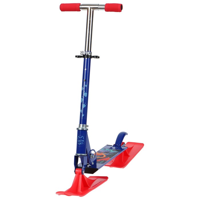 Детский самокат-снегокат предназначен для летнего и зимнего активного отдыха. Конструкция представляет собой раму самоката, на которую можно установить лыжи или колёса. Передняя лыжа/колесо управляется поворотом руля. На колёсах можно кататься по любым ровным поверхностям в сухое время года, на лыжах — по снегу.