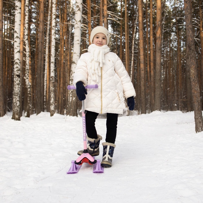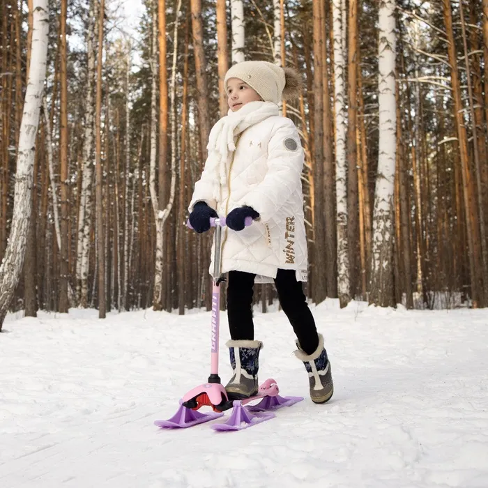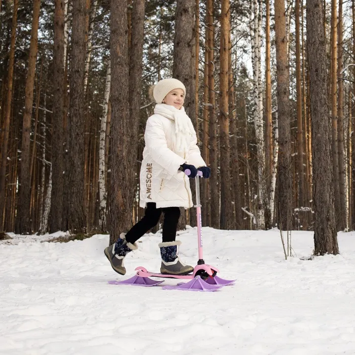 Самокат-снегокат актуален зимой и летом. На колёсах можно кататься по любым ровным поверхностям в сухое время года, зимой — на лыжах по снегу.