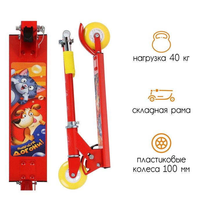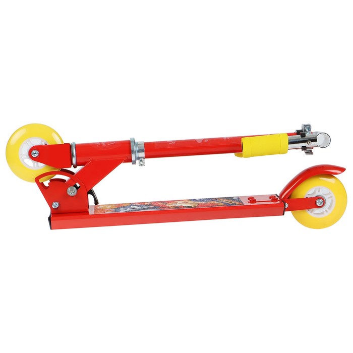 Платформа с шероховатым покрытием предотвращает скольжение ног. Высота руля регулируется и фиксируется в трёх положениях. Рама складывается: рулевая стойка опускается к деке. В таком положении самокат занимает мало места.
