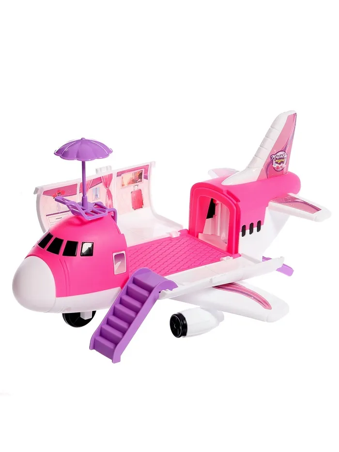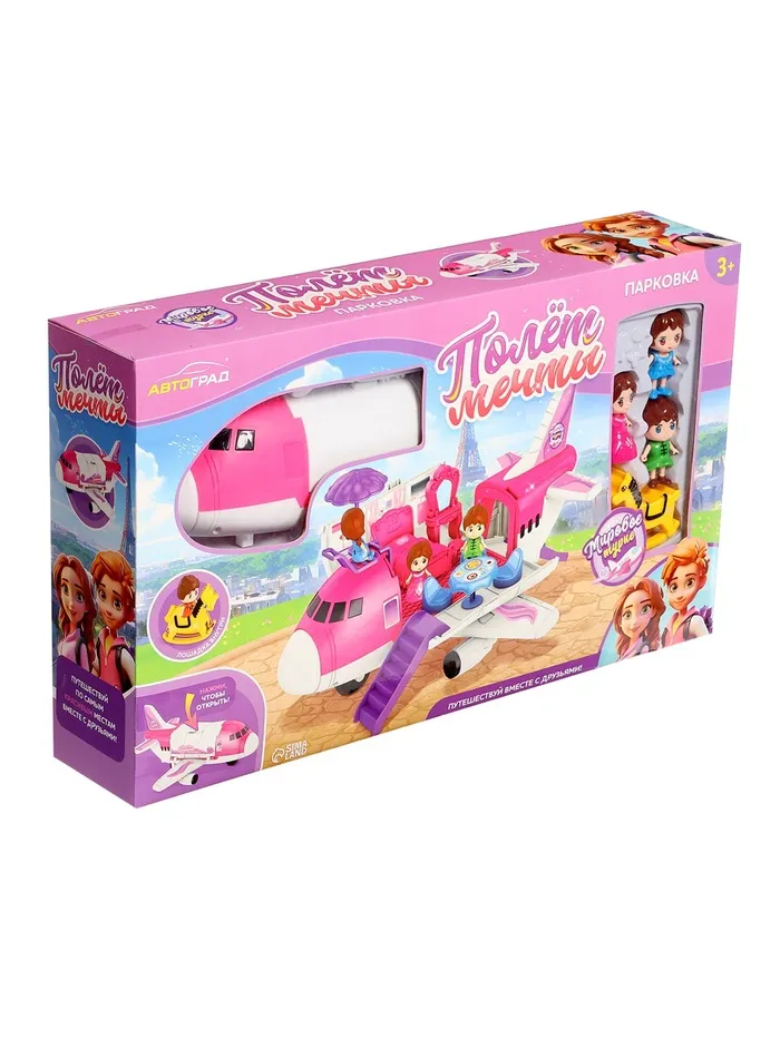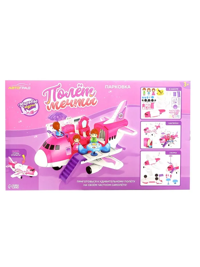Самолёт-парковка «Полёт мечты» — развивающий набор для маленьких принцесс от 3 лет. С ним малышка сможет почувствовать себя настоящей путешественницей и пассажиркой прекрасного розового лайнера. Этот комплект включает в себя самолёт и парковку. Набор позволяет детям создавать свои собственные сценарии игр, развивая воображение и мелкую моторику.