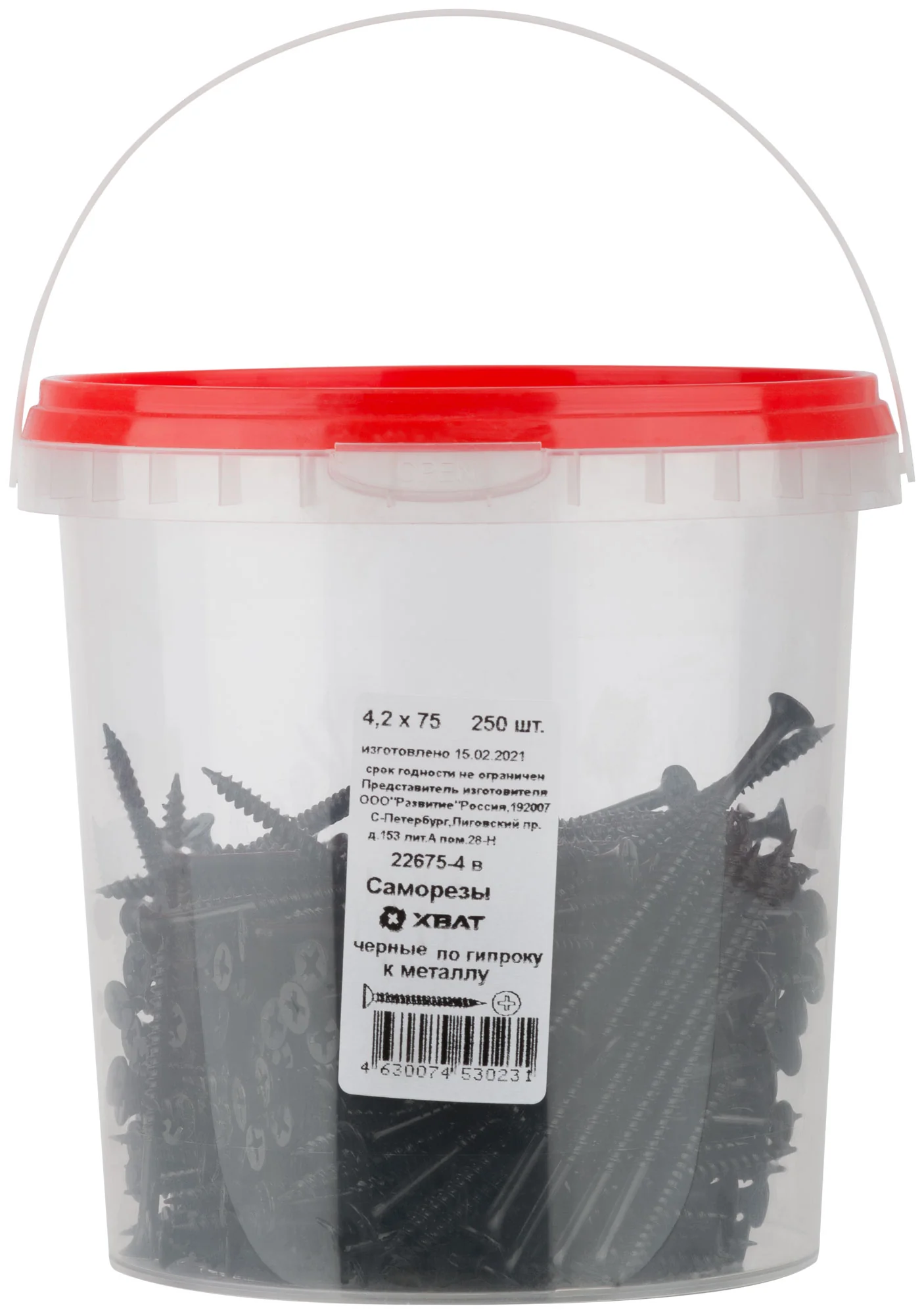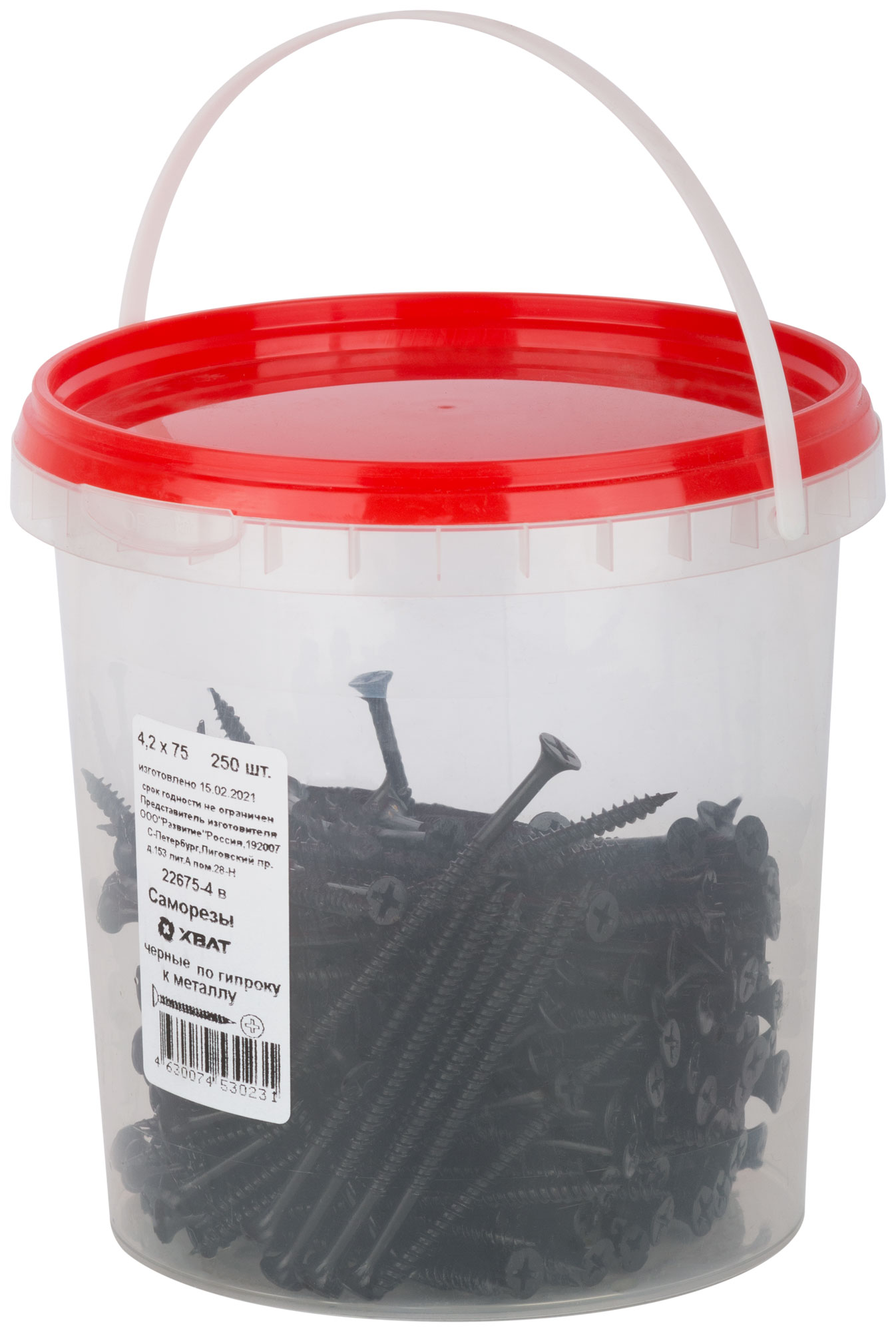 Черные саморезы по гипроку от бренда XВАТ имеют стандартный типоразмер 4,2 х 75 мм и поставляются в удобной фасовке — ведро из 250 штук. Они фосфатированы, что обеспечивает дополнительную защиту от коррозии и долговечность в эксплуатации.