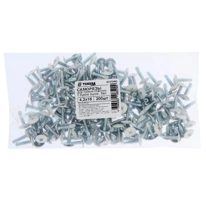 Саморезы ТУНДРА krep для тонк. пластин с буром 4.2x16, белый/белый цинк, 200 шт. — Характеристики