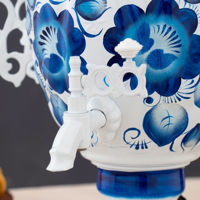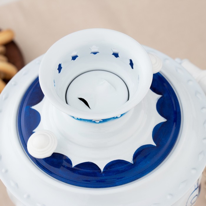 В самоваре установлен донный ТЭН, который позволяет держать минимальный уровень в самоваре. Мощность 220 Вт. Ее достаточно, чтобы вскипятить 3-х литровый самовар за 15 минут и при этом не разориться на электроэнергии.