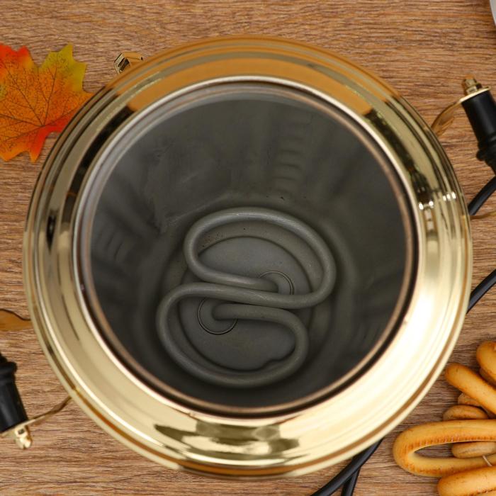 В самоваре установлен донный ТЭН, который позволяет держать минимальный уровень в самоваре. Мощность 220 Вт. Ее достаточно, чтобы вскипятить 3-х литровый самовар за 15 минут и при этом не разориться на электроэнергии.