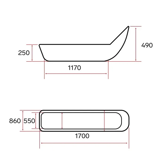 • Размеры: 1700 x 860 x 490 мм; ширина дна — 550 мм