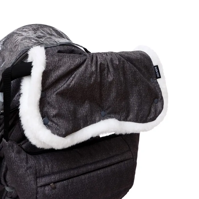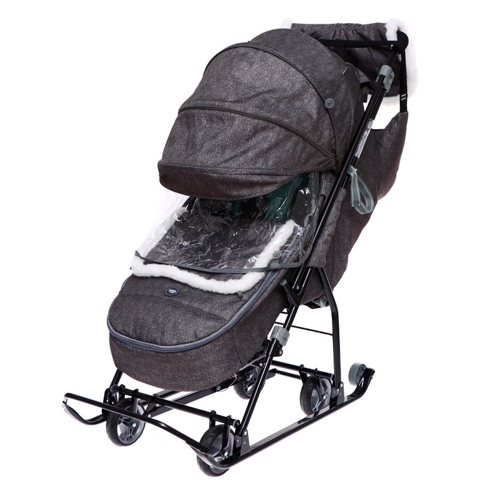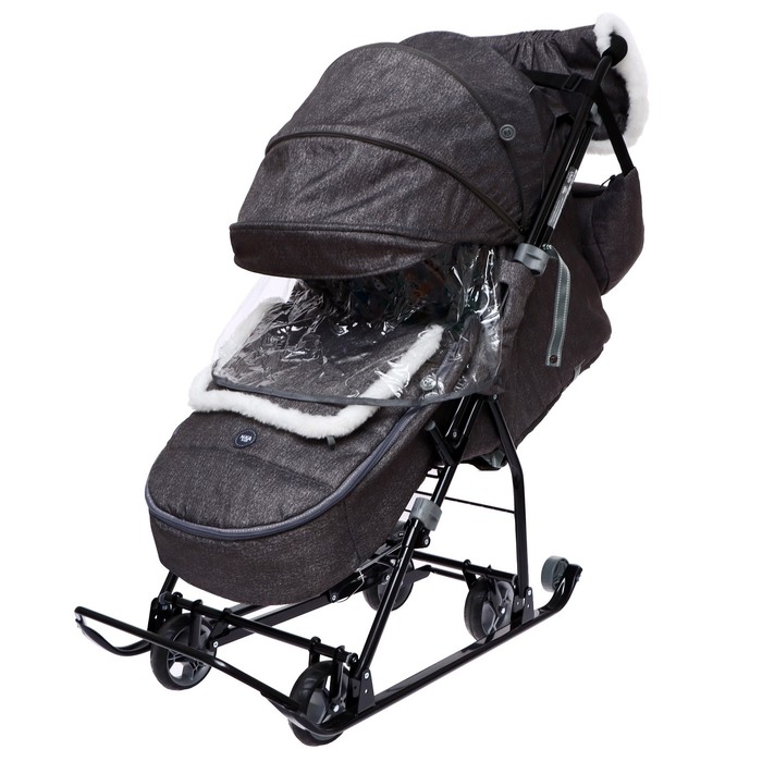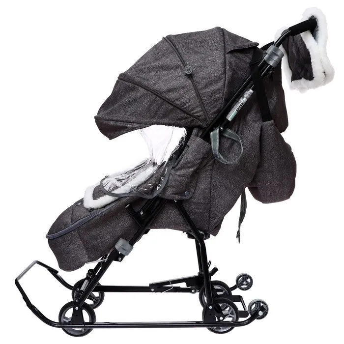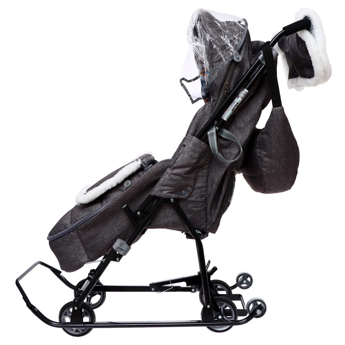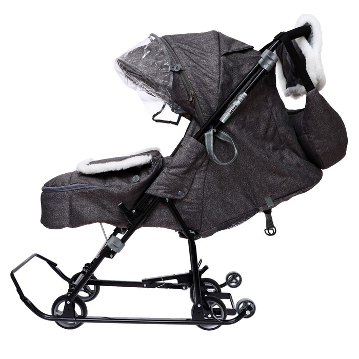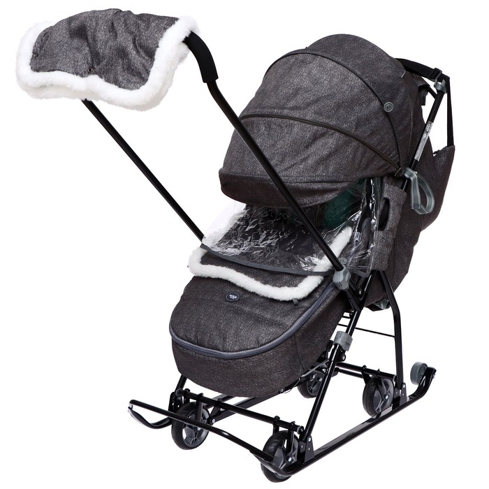 - В комплекте — муфта с меховой отделкой для рук родителей, сумка, съёмный чехол для ног с круговой молнией и прозрачный тент-дождевик.