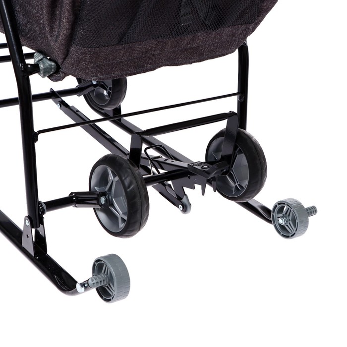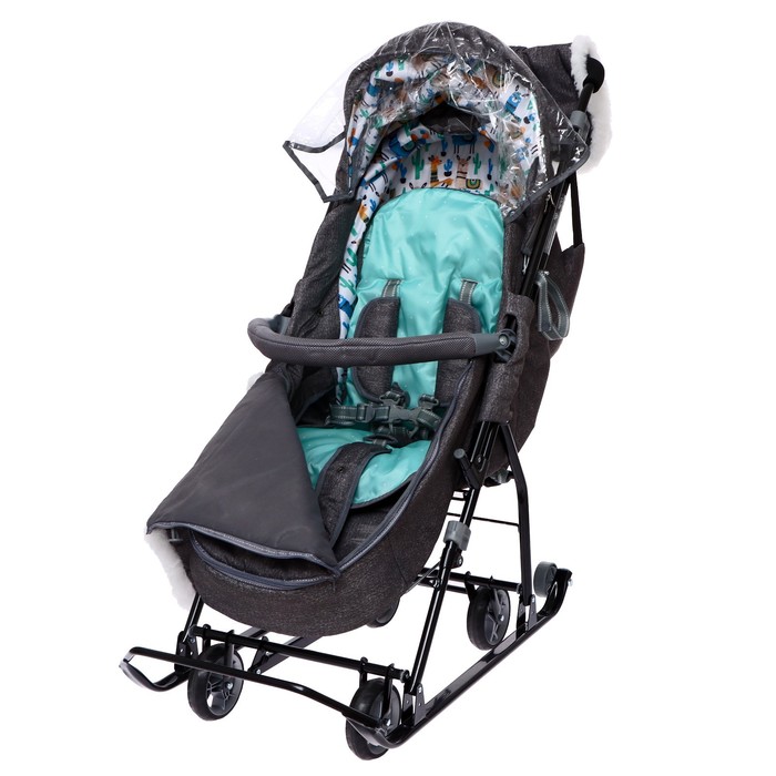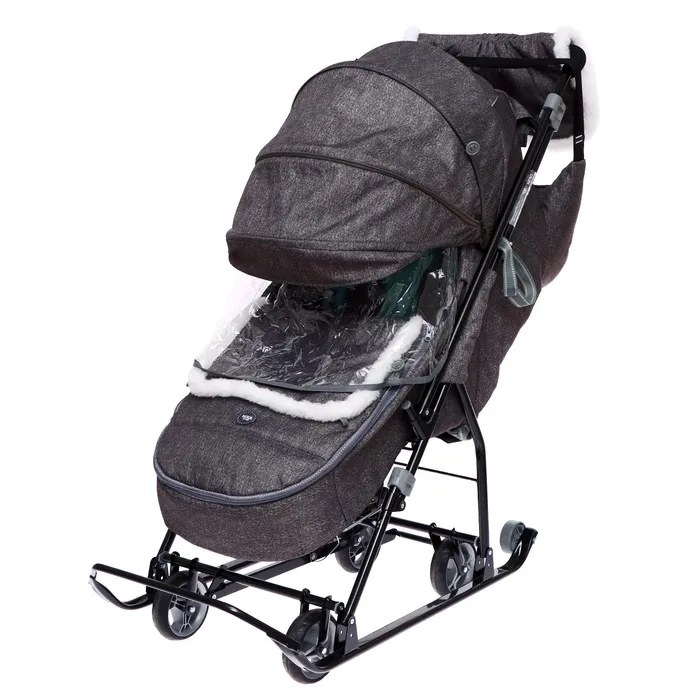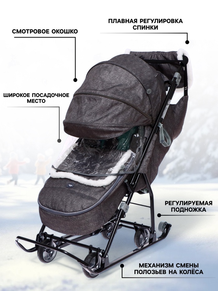 - Санки легко превращаются в коляску — выдвижные колёса и дополнительные ролики на полозьях позволяют кататься по разным поверхностям.