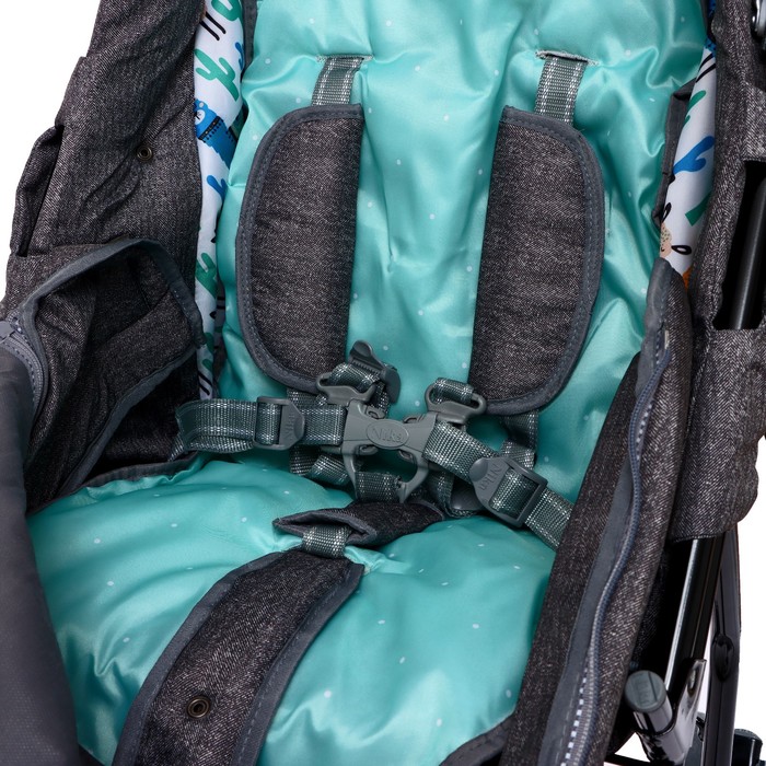 - Пятиточечный ремень надёжно фиксирует ребёнка, а съёмный мягкий бампер защищает от ударов.