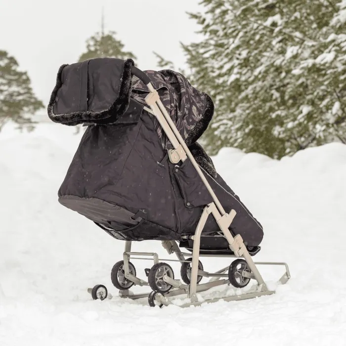 - В комплекте — муфта с меховой отделкой для рук родителей, сумка, съёмный чехол для ног с молнией по центру и прозрачный тент-дождевик.