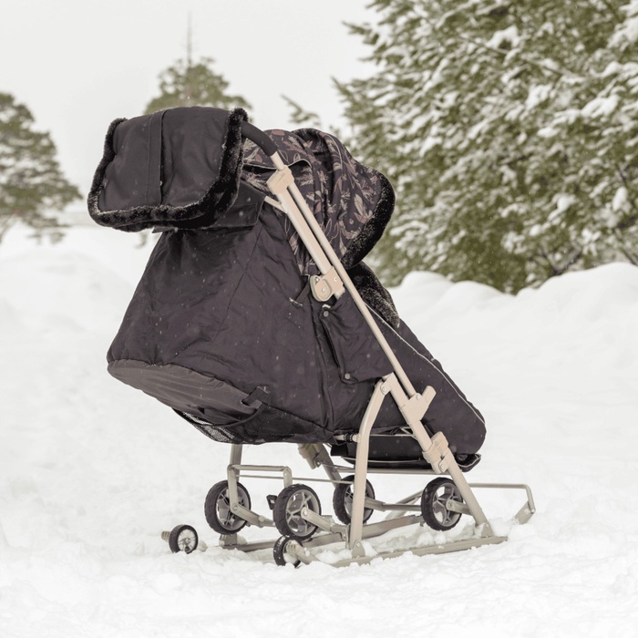 - Санки легко превращаются в коляску — выдвижные колёса и дополнительные ролики на полозьях позволяют кататься по разным поверхностям.
