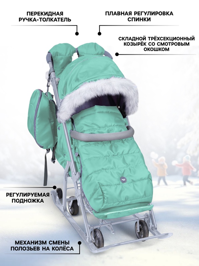Тепло и комфорт на зимней прогулке! Санки-коляска «Ника детям 7-5SK» в мятном цвете — это удобный транспорт для малыша с утеплёнными аксессуарами. Широкие полозья и колёсная база обеспечивают плавный ход по снегу и асфальту, а продуманная конструкция делает прогулки приятными в любую погоду.