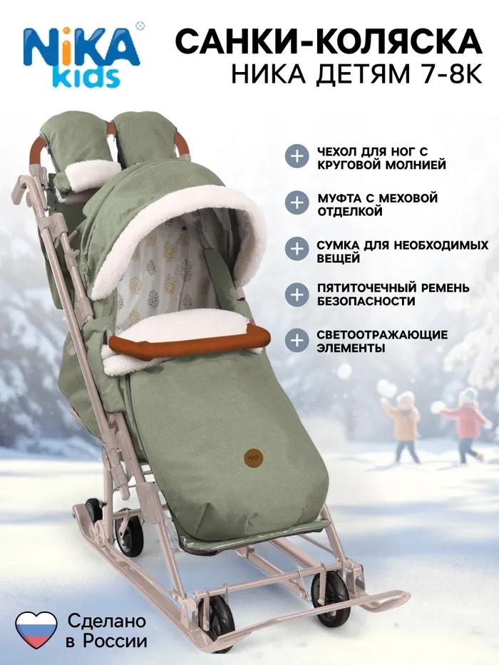Санки - коляска «Ника Детям 7-8K», чехол для ног, рукавички, сумка, оливковый — Характеристики