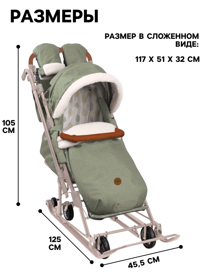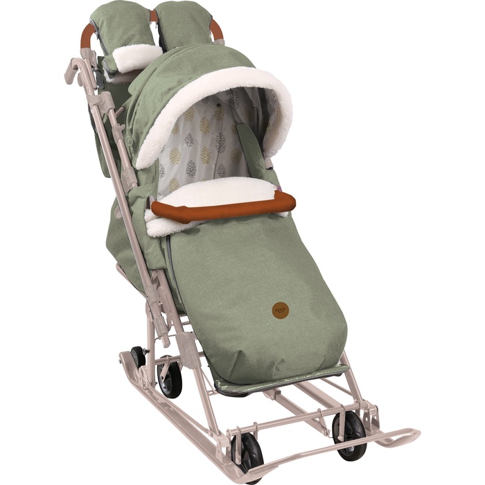 Санки-коляска с утеплённым чехлом и рукавичками создана для долгих зимних прогулок. Ребёнок остаётся в тепле, а родители могут легко управлять санками благодаря эргономичной ручке. Привлекательный оливковый цвет и бежевый каркас выделит ваши сани среди других — стильно и практично!