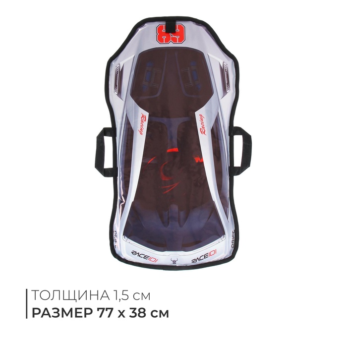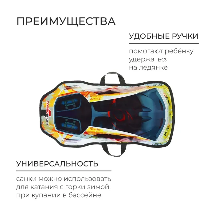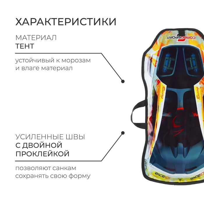 Прочный морозоустойчивый материал ПВХ и усиленные швы с двойной проклейкой позволяют санкам сохранять свою форму при температуре до ‒30 °С и при любых испытаниях, которым их подвергнет юный гонщик.