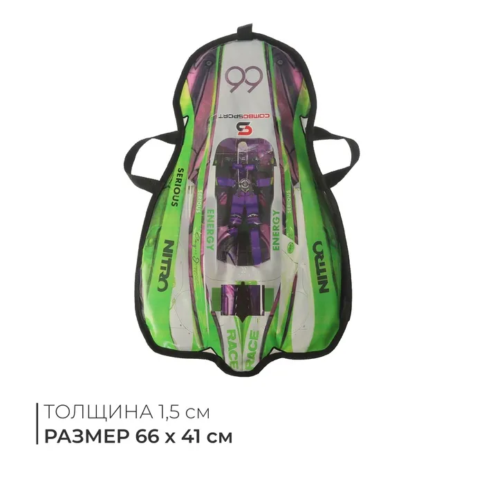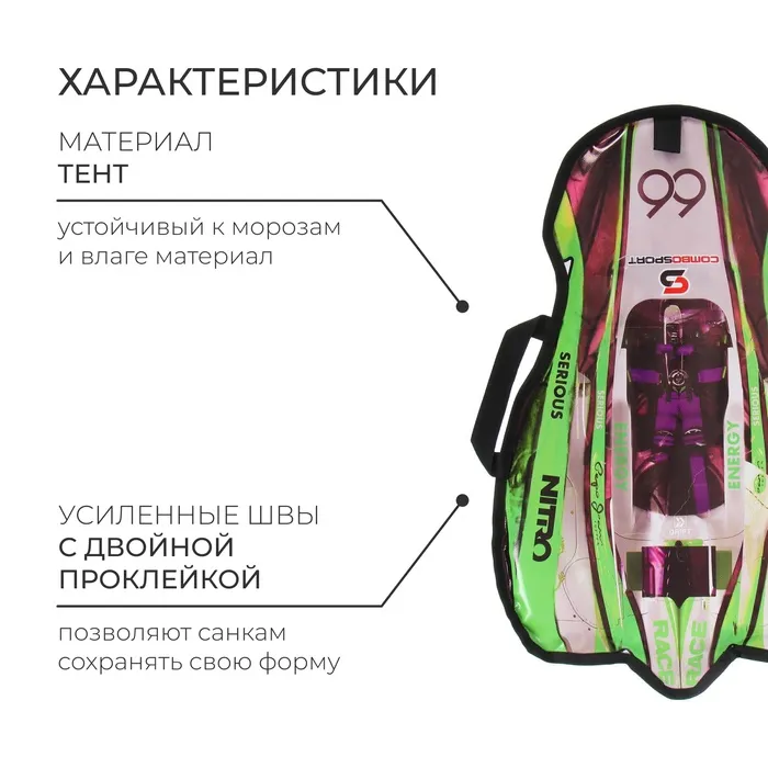 Прочный морозоустойчивый материал ПВХ и усиленные швы с двойной проклейкой позволяют санкам сохранять свою форму при температуре до ‒30 °С и при любых испытаниях, которым их подвергнет юный гонщик.