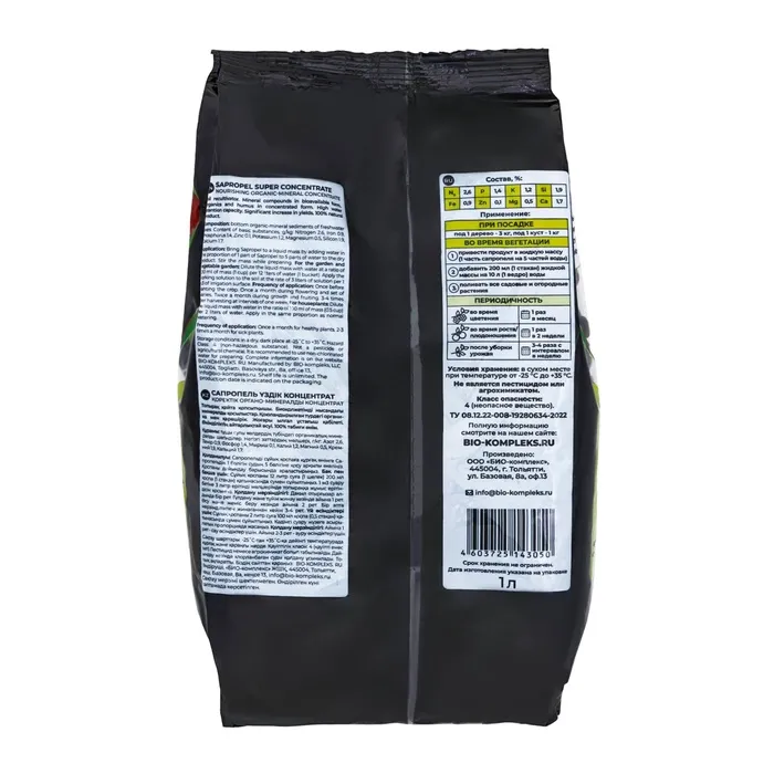 Состав: Органические вещества, переработанные донными бактериями без доступа кислорода (нет оксидантов): гуминовые кислоты, аминокислоты, витамины, ферменты, фитогормоны, природные антибиотитки. Макро- и микроэлементы (N, K, P, Mg, Fe, Zn, Co, Mn, Cu, B, Zn, Br, Mo, V, Cr, Be, Ni, Ag, Sn, Pb, As, Ba, Sr, Ti).