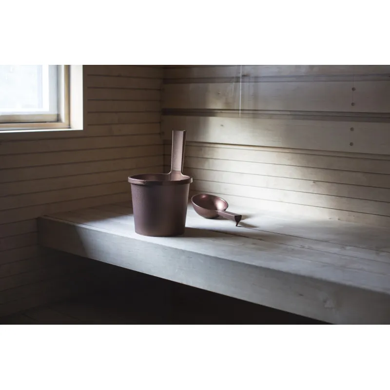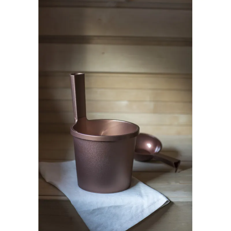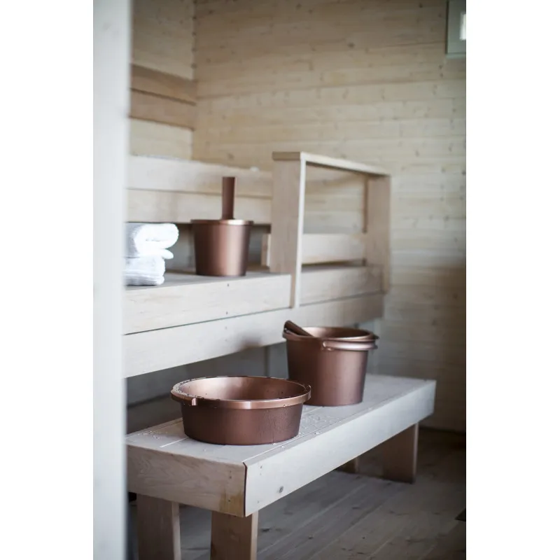 Добавьте новый стиль вашему саунному пространству с трендовым медным ведром от Orthex. Это 10-литровое саунаведро станет отличным дополнением к вашему интерьеру ванной комнаты и сауны. Оно имеет стильный дизайн и полупрозрачный медный цвет. Эргономичная ручка обеспечивает удобство использования. Ведро изготовлено из прочного пластика и выдерживает температуру до 65 °C. Разработано финским дизайн-агентством Pentagon Design. Размеры: 32 x 32 x 22 см.