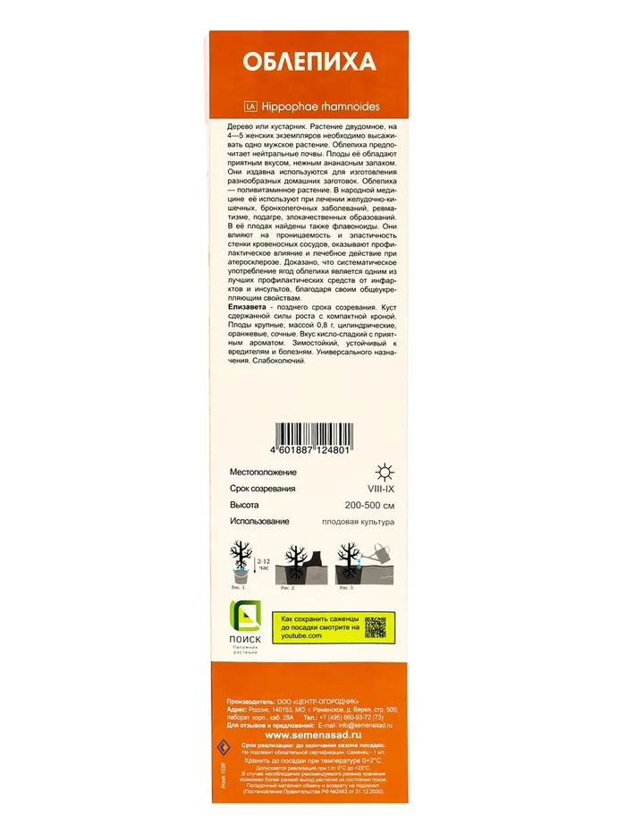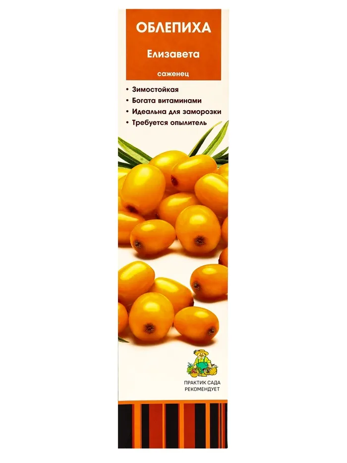 Сорт облепихи Елизавета раннего срока созревания. Облепиха Елизавета формирует среднерослый многоствольный кустарник полукарликовой формы. Легко формируется деревцем с аккуратной овальной кроной. Благодаря сдержанному росту, идеально подходит для небольших любительских садов. Побеги без колючек - весомый плюс элитного современного сорта! Ягоды крупные, правильной цилиндрической формы, ярко-оранжевые, с высоким содержанием витамина С. Плодоножки очень длинные, что обеспечивает сухой отрыв и облегчает сбор. Вкус ягод сладкий, не свойственный облепихе, с приятным лимонно-фруктовым ароматом. Зимостойкость высокая, без проблем зимует на Урале. Урожайность отменная! - С двух взрослых кустов ягоды собираем ведрами. Сорт универсального назначения: благодаря крепкой кожице, которая надежно сохраняет мякоть от повреждений, ягоды долго хранятся в свежем виде, их консервируют и замораживают для увеличения сроков хранения.