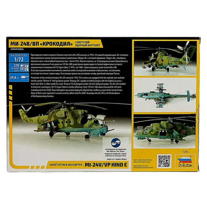 Пластиковая сборная модель советского ударного вертолёта Ми-24 В/ВП «Крокодил» выполнена с высокой точностью в масштабе 1:144. Она станет настоящей гордостью, как начинающего, так и опытного коллекционера. Сборка модели — кропотливый, но увлекательный труд. Если запастись терпением и приложить немного усилий, то можно получить результат, превосходящий все ожидания. Детям младшего возраста в этом деле не обойтись без помощи старших. Моделирование развивает внимание, терпение, аккуратность и творческие способности.