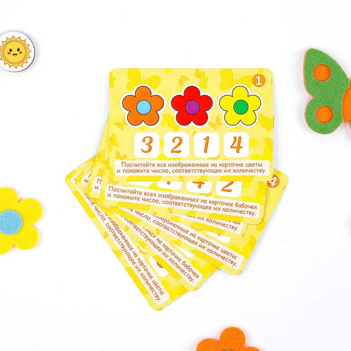 - Математическая игра «Посчитай-ка!». Возьмите дополнительную карточку № 1 (сторона с жёлтым фоном). Предложите ребёнку посчитать всех изображенных на карточке бабочек (цветочки) и показать число, соответствующее их количеству. Продолжите игру с другими карточками по порядку.