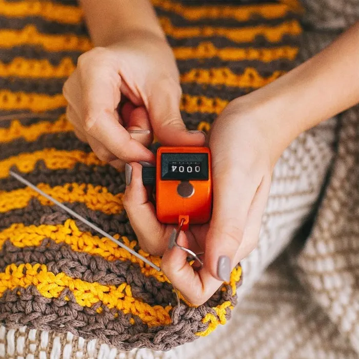 Не запутаться в готовых рядах поможет специальный счётчик. Он надевается на спицу или нитку, и при окончании последовательности вам нужно повернуть колёсико, чтобы обновить цифру. Такая система позволит спокойно откладывать вязание, если вам срочно нужно заняться другими делами.