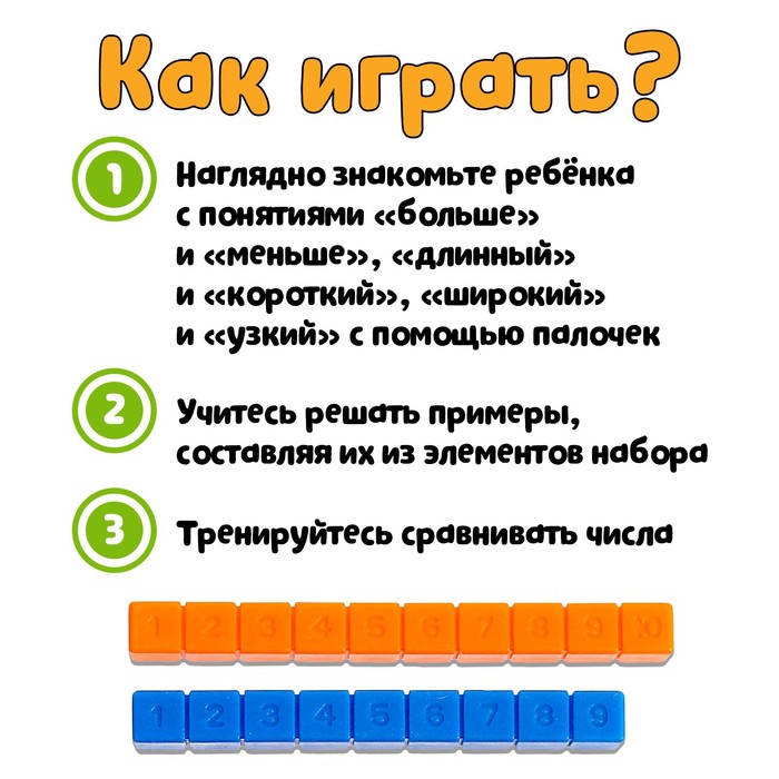 Пластиковые счётные брусочки созданы по методике Джорджа Кюизенера для изучения основ математики. Набор подходит для обучения детей разного возраста.