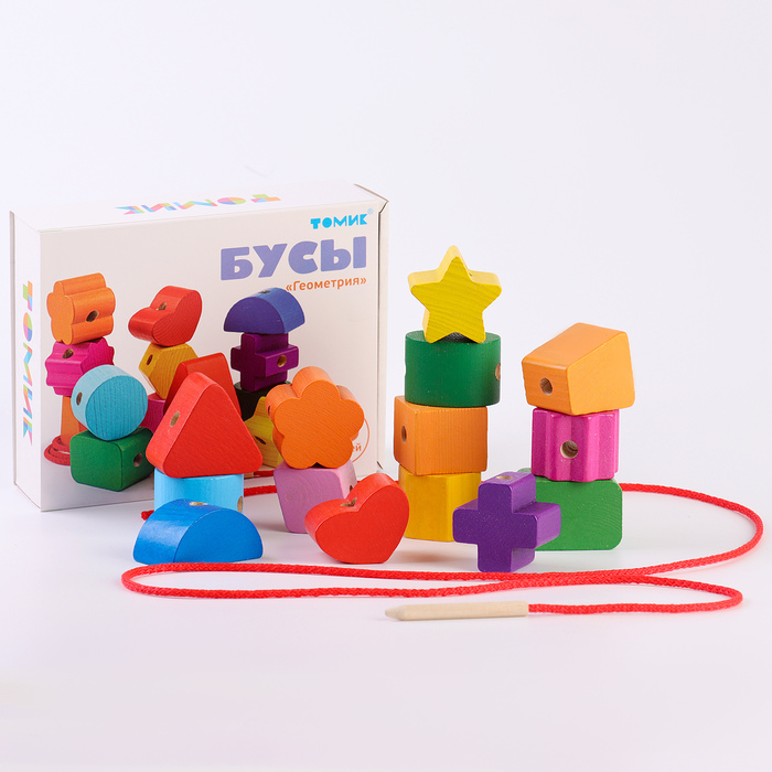 Логический игровой набор бус изготовлен из сосны и состоит из 15 деталей, окрашенных водными экологичными красками.