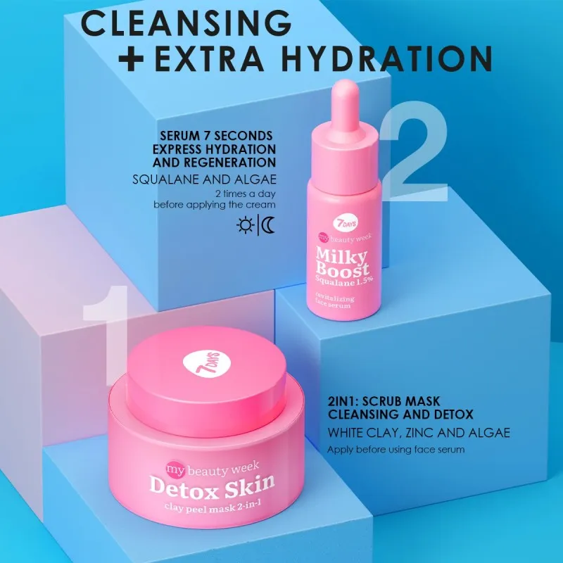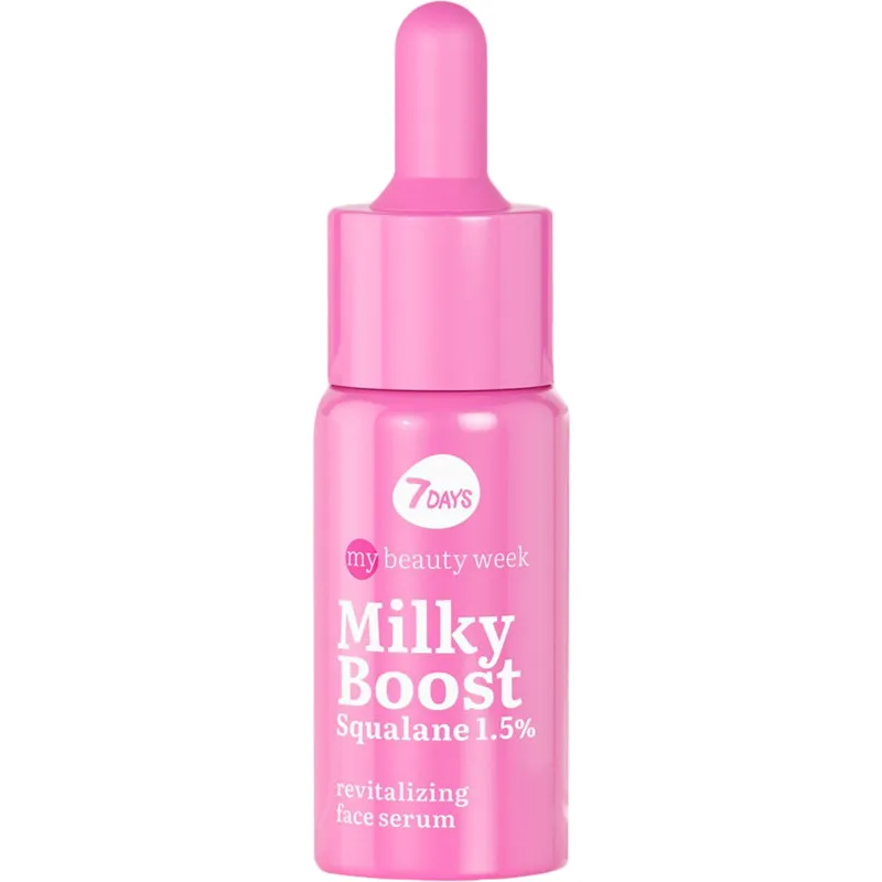 7 Days Revitalizing Milky Boost Squalane - это сыворотка, помогающая восстанавливать, увлажнять и подтягивать кожу лица. Легкая текстура с приятным ароматом наполнена мощными активными ингредиентами. Сыворотка содержит сквалан, который помогает смягчать кожу, устранять покраснения и укреплять липидный барьер кожи. Экстракты водорослей и фукуса запирают влагу и оказывают антивозрастное и подтягивающее действие. Нанесите небольшое количество на очищенную кожу лица и дайте полностью впитаться. Объем упаковки 20 мл.