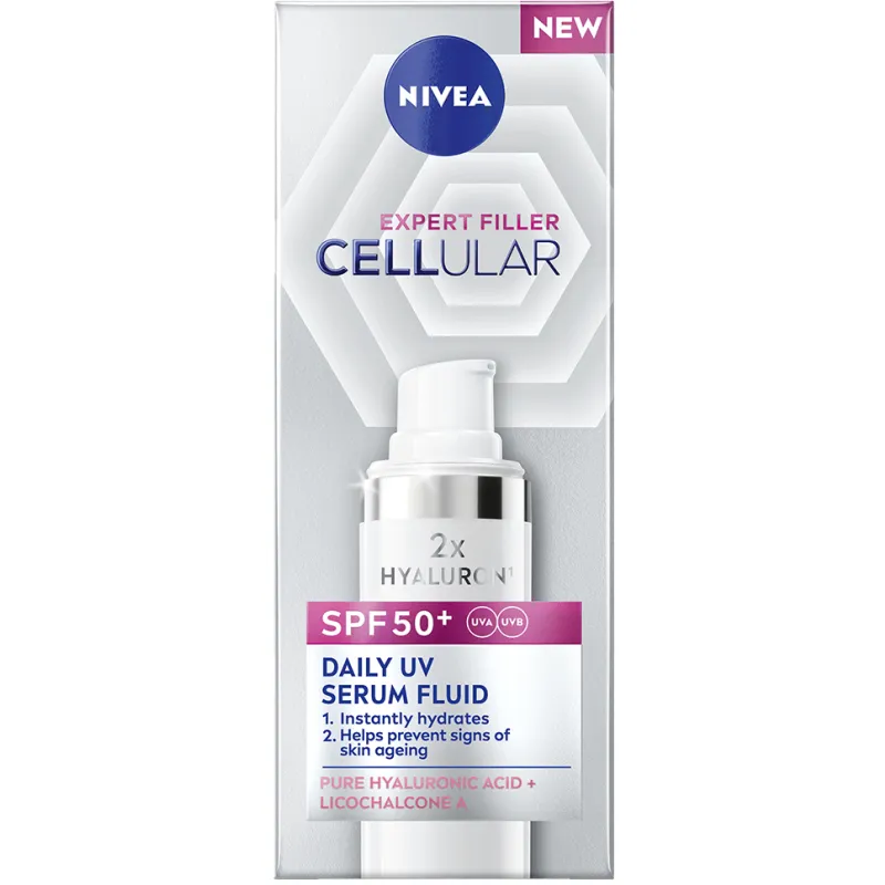 Nivea Cellular Expert Filler Daily UV Fluid SK50 — это сыворотка-дневной крем, который эффективно защищает кожу от ежедневного воздействия UV-лучей и одновременно устраняет признаки старения кожи. Легкая и не липкая текстура крема делает его невидимым на коже. Формула включает защитный фактор 50+, два вида гиалуроновой кислоты и Licochalcone A. Без отдушек, подходит для всех типов кожи, включая чувствительную. Объем упаковки: 30 мл.