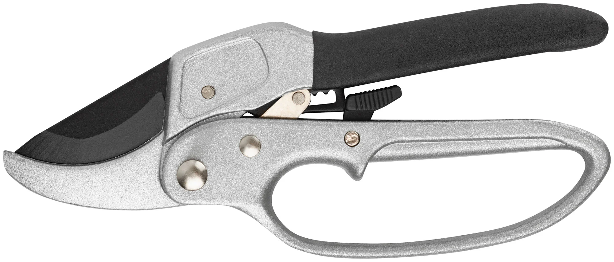 При работе с этим инструментом вы оцените эргономичную ПВХ накладку на ручке, которая предотвращает скольжение и делает использование секатора максимально комфортным. Компактный размер (200 мм) позволяет без труда маневрировать даже в густых зарослях.