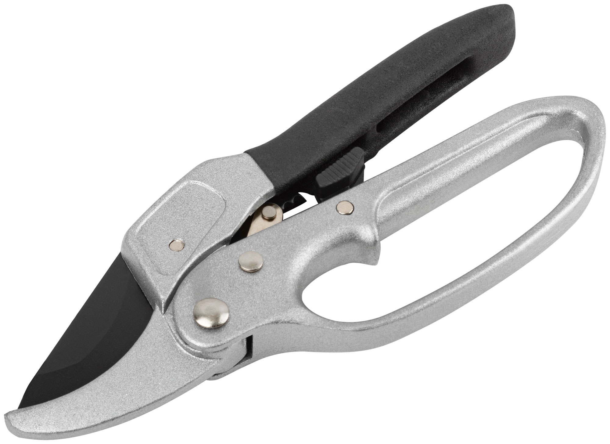 Секатор оснащен режущей кромкой встык с упорной наковальней, что обеспечивает чистый и аккуратный рез. Храповый механизм дожима усиливает срез, облегчая работу с более толстыми ветками. Корпус выполнен из легкого, но прочного алюминиевого сплава, а лезвия изготовлены из высокоуглеродистой стали с тефлоновым покрытием, что увеличивает их долговечность и предотвращает налипание растительных остатков.