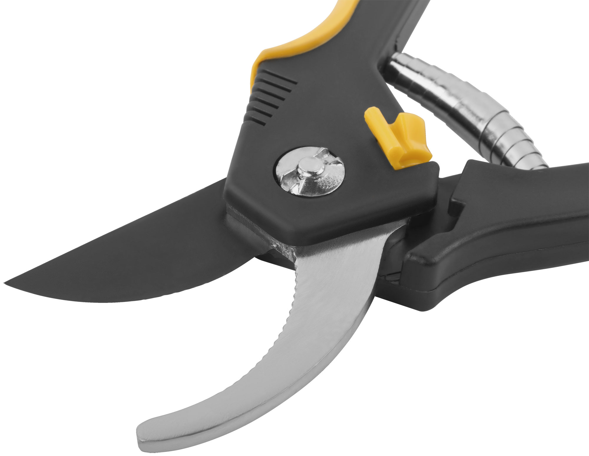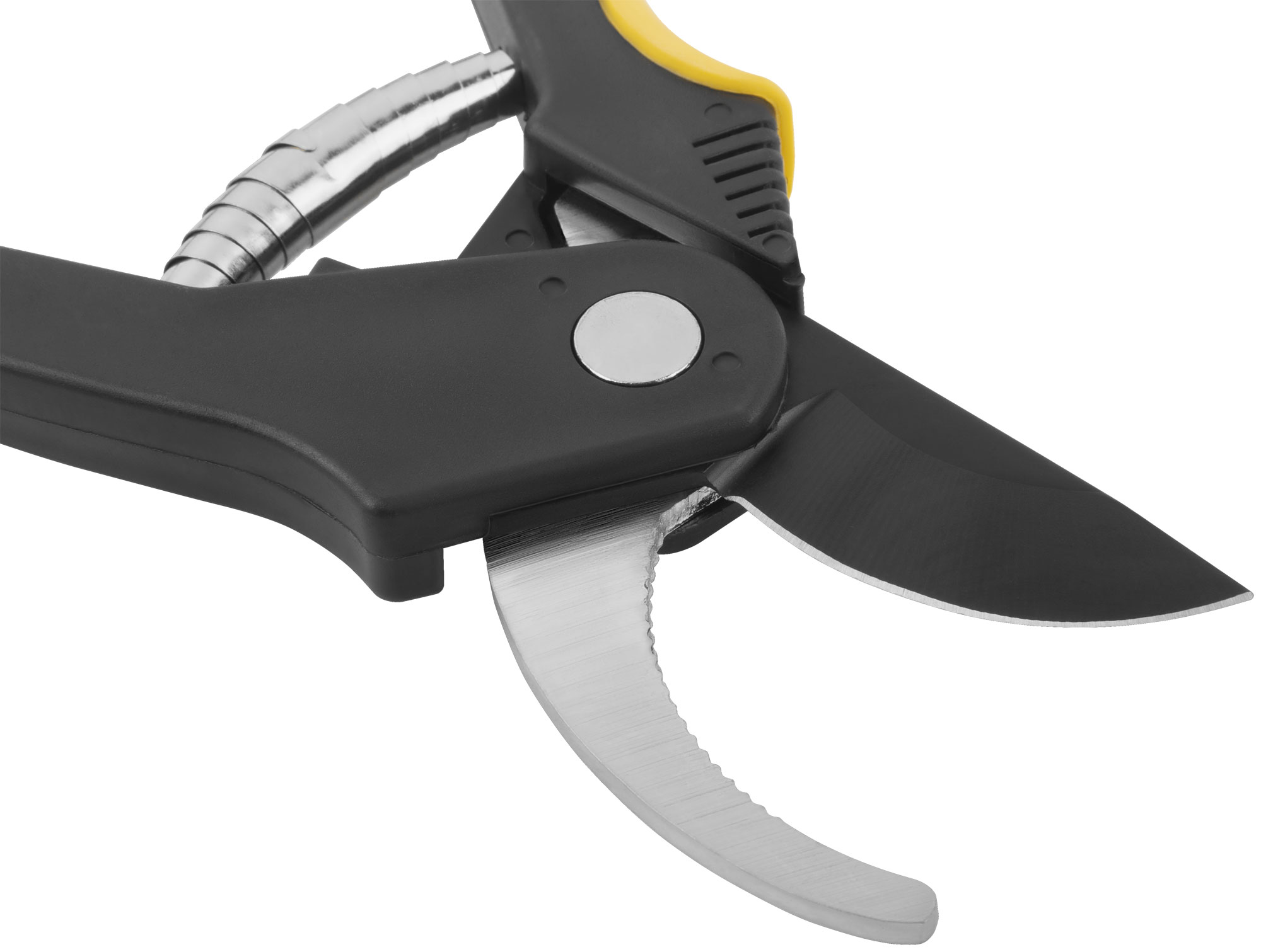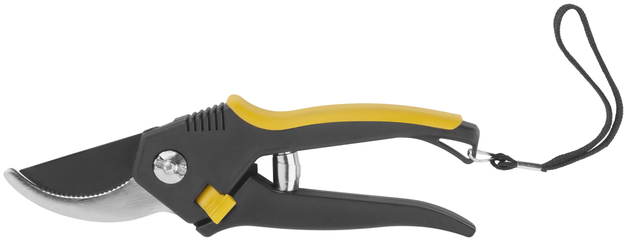 Лезвия секатора изготовлены из высокоуглеродистой инструментальной стали с тефлоновым покрытием, что обеспечивает долговечность и защиту от коррозии. Прорезиненные пластиковые ручки гарантируют надежный захват и комфортную работу даже в условиях повышенной влажности.
