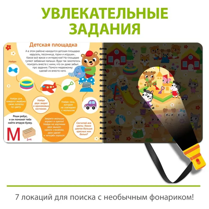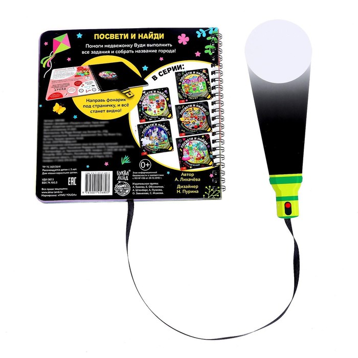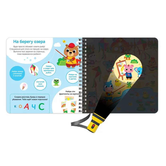 Чтобы найти эти слова, вам понадобится фонарик. Он выполнен из картона и привязан к книжке на шнурок.