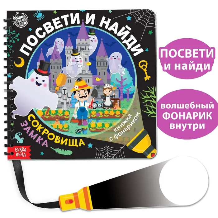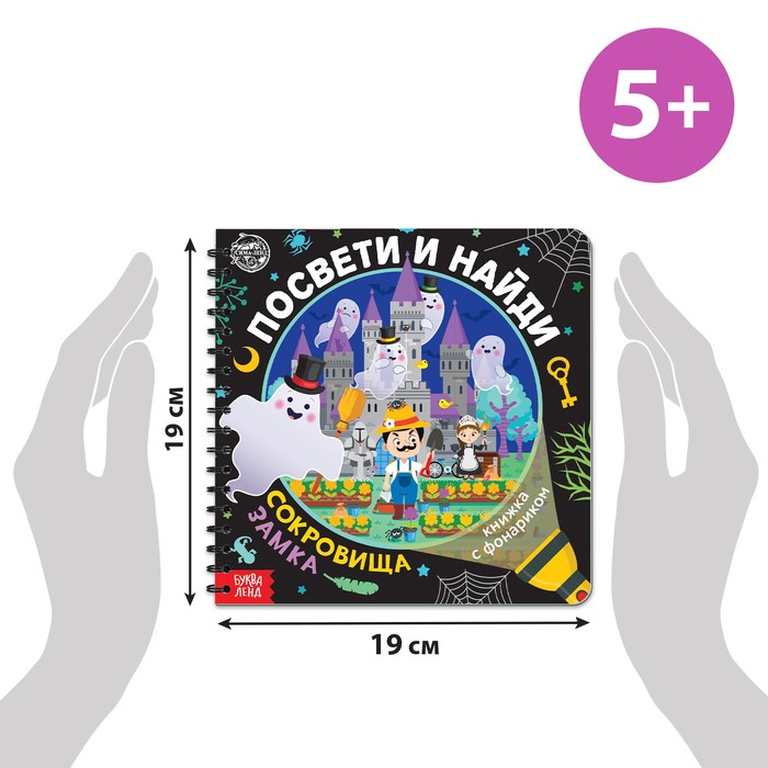 Чтобы отыскать спрятанные сокровища, вам понадобится фонарик. Он выполнен из картона и привязан к книжке на шнурок.