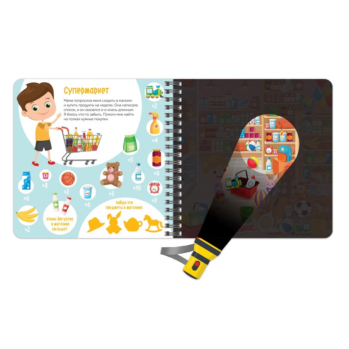 Для игры вам понадобится фонарик. Он выполнен из картона и привязан к книжке на шнурок.