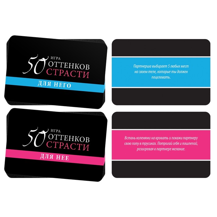 Приглушите свет, включите романтическую музыку и уберите мобильные телефоны, чтобы ничего не отвлекало вас от процесса. Вытягивайте карты из колод, читайте фанты и выполняйте задания вместе с аксессуарами. Также вы можете дополнять написанные задания, придумывая собственные сценарии ролевых игр.
