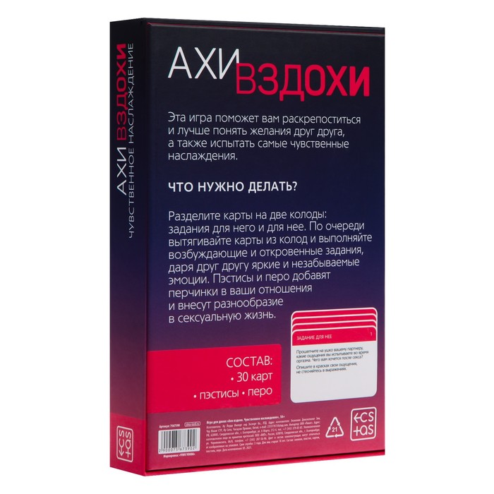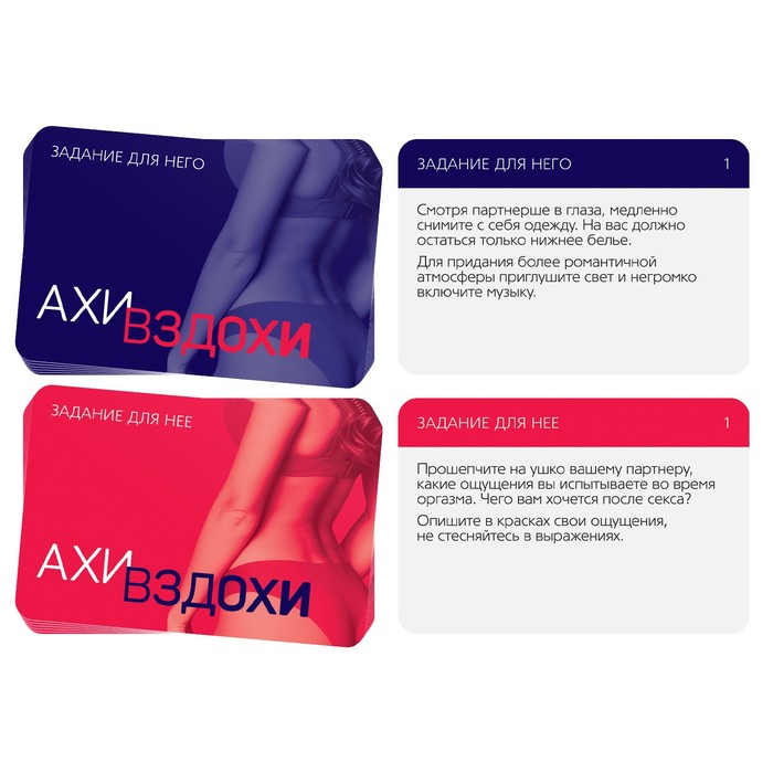 «Ахи-вздохи» — это серия эротических игр для двоих, которая включает невероятное множество пикантных заданий-фантов для него и для неё. Здесь найдутся игры в формате вопрос-ответ, ролевые развлечения и необычные позы для секса. Игры серии «Ахи-вздохи» подойдут для тех, кто только начал романтические отношения и хочет узнать друг друга поближе, а также для пар, союз которых длится уже долго.
