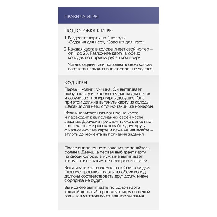 Хотите сделать каждый день с любимым человеком незабываемым? Тогда пришло время перейти к романтическим действиям, которые разнообразят отношения и разделят их на: до и после. Секрет, как этого добиться, прост: вытягивайте карточки, готовьте для второй половинки приятные сюрпризы и наслаждайтесь совместным временем!