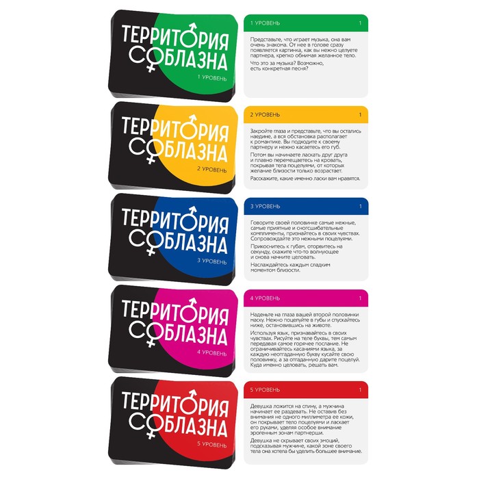 «Территория соблазна» – это серия эротических игр для двоих, в основе которой лежит акцент на раскрепощения. Разговоры, лёгкие прикосновения, пикантные фанты, прелюдия к сексу и постепенный переход к самому главному – сексу. Серия включает в себя наборы с аксессуарами, карточные игры, наборы кубиков и т.д.