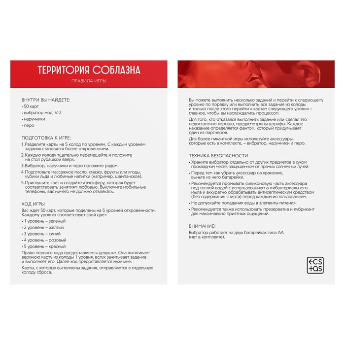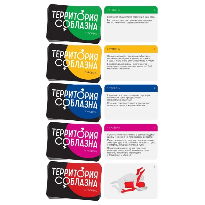 «Территория соблазна» – это серия эротических игр для двоих, в основе которой лежит акцент на раскрепощения. Разговоры, лёгкие прикосновения, пикантные фанты, прелюдия к сексу и постепенный переход к самому главному – сексу. Серия включает в себя наборы с аксессуарами, карточные игры, наборы кубиков и т.д.