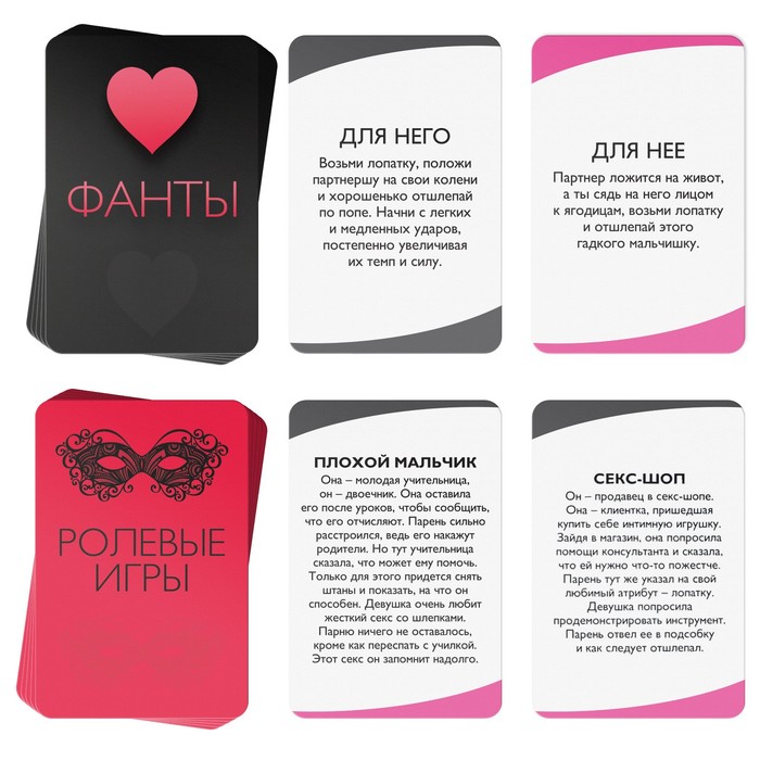 В комплекте вас ждут карточки с фантами «Для него» и «Для неё». По очереди вытягивайте карточки из своей колоды и выполняйте задания. Выполняя фанты, вы можете использовать лопатку, а можете обойтись и без неё. Фанты – это прелюдия к самому интересному – сексу.