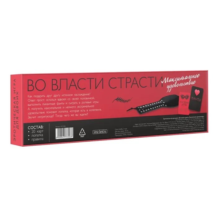«Во власти страсти» – это серия эротических игр для двоих, главная особенность которой – большое количество ролевых игр и сценариев проведения романтического вечера. Серия включает себя карточные игры, наборы с аксессуарами, наборы кубиков и т.д.