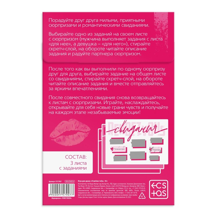 Перед вами романтические задания, которые подарят каждому искренние и незабываемые эмоции. Наслаждайтесь друг другом, играйте, открывайте новые грани чувств и вместе отправляйтесь за яркими впечатлениями!