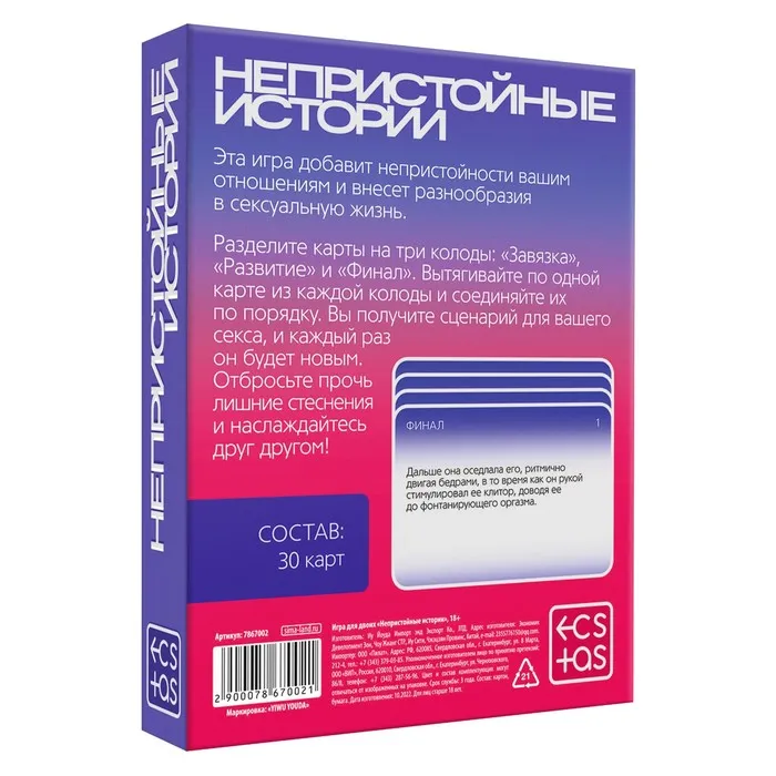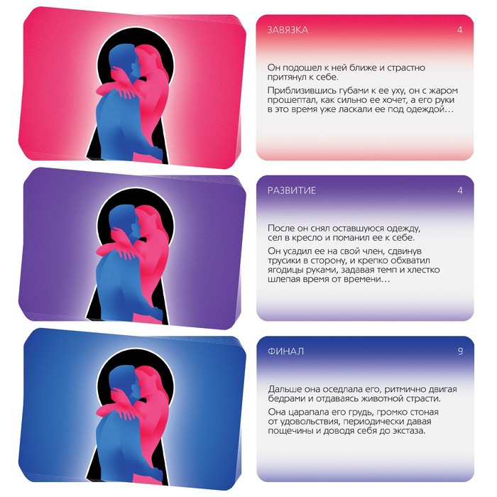 Разделите карты на три колоды: «Завязка», «Развитие» и «Финал». Вытягивайте по одной карте из каждой колоды и соединяйте их по порядку. Вы получите сценарий для вашего секса, и каждый раз он будет новым. Отбросьте прочь лишние стеснения и наслаждайтесь друг другом!