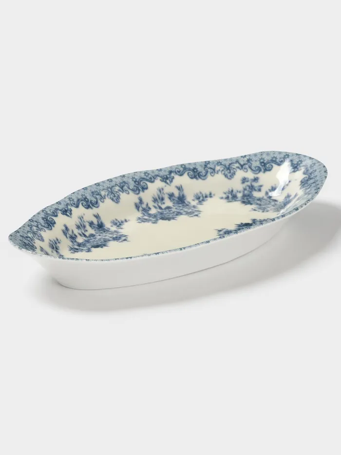 Фарфоровая селедочница овальной формы с классическим бело-синим орнаментом — универсальная посуда для подачи закусок. Размеры 25×13 см удобны для порционной сервировки.