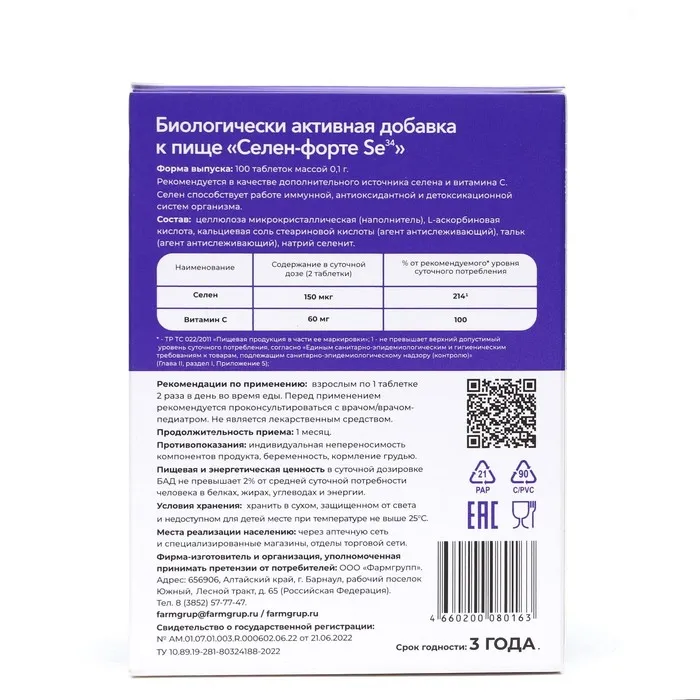 Форма выпуска: 100 таблеток массой 0,1 г. Рекомендуется в качестве дополнительного источника селена и витамина С. Селен способствует работе иммунной, антиоксидантной и детоксикационной систем организма.