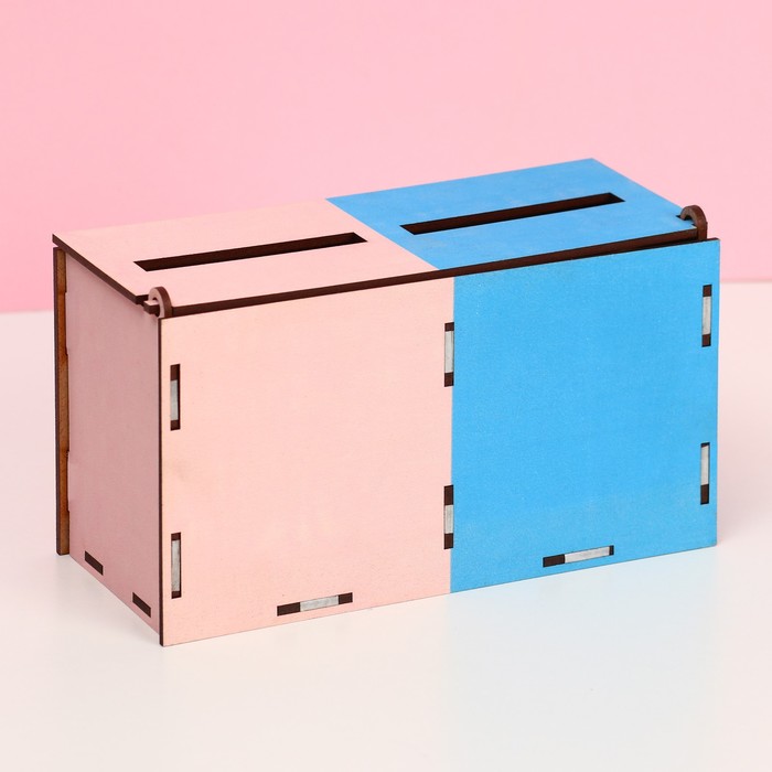 Свадебный банк для сбора денег на новорожденных, подходит для гендер-пати, также это оригинальный способ сбора денег на свадьбе. Пожалуй, самым веселым, забавным и любимым конкурсом на свадьбе считается гадание, какого пола будет первенец в новой семье - мальчик или девочка. В какой секции окажется больше денег, в розовой или синей, того пола и будет первенец у молодоженов. Семейный банк поставляется в собранном виде.