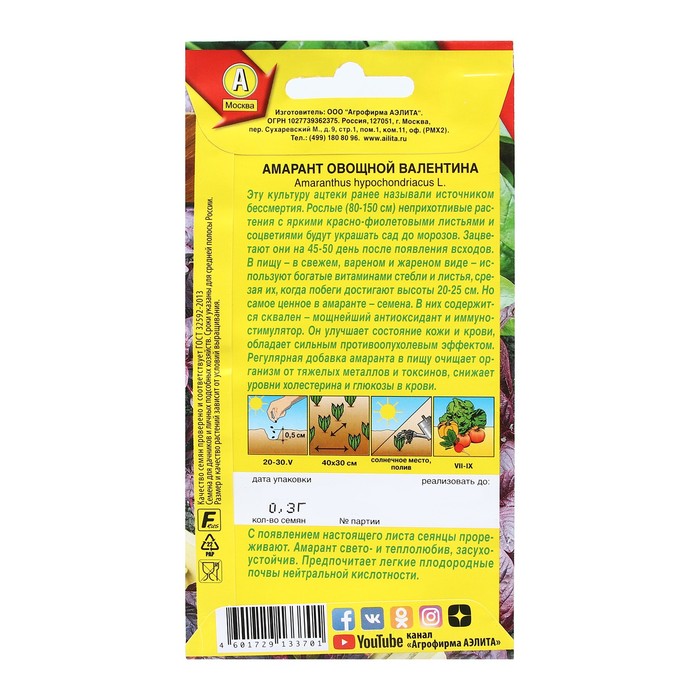 Раннеспелый сорт высотой 100-170 см, является источником растительного легкоусвояемого белка. По всему стеблю растения расположены густооблиственные побеги. Листья красно-фиолетовые, соцветие фиолетовой окраски, прямостоячее. Урожайность зелени до 4,2 кг/м2. Амарант требователен к теплу и свету, но непривередлив к почве: растет на любой, в том числе кислой, песчаной, солонцеватой. Легко приспосабливается к различным условиям выращивания. Выносит осенние холода. Сорт рекомендуется для использования в качестве салатной культуры, в кулинарии, а также как источник сырья для получения натурального пищевого красно-фиолетового красителя. Используется молодая, нежная, сочная зелень в салатах и кулинарии, для приготовления напитков. Цветущие растения высушивают и используют в чаях, в качестве натуральных красителей, пищевых добавок.