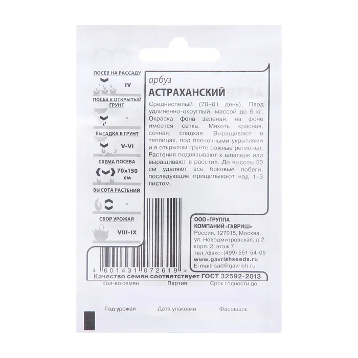 Среднеранний сорт высокоплодородного бахчевого растения. От всходов до плодов 75 – 82 дня. Арбуз Астраханский, благодаря плетям средней величины, можно выращивать: в теплицах, укрытиях, высоких грядах, плёночных парниках и туннелях с выходом плетей наружу. В открытом грунте располагайте участок с Астраханским на открытом, хорошо прогреваемом, южном или юго – западном склоне. Листья растения небольшие, зелёные с сизоватым отливом, пластинка сильно рассечённая. Семена ровного чёрного цвета. Огромную пищевую и товарную ценность представляют плоды арбуза Астраханского от фирмы «Поиск». Они обладают округлой, иногда немного овальной формой, средней массой от 4,5 до 6,0 кг. Корка средней толщины, окраска зелёная, с чёрными полосками. Мякоть красная, сочная, сладкая, сахаристая, нежная, плотной структуры. Вкусовые качества спелого плода отличные. Астраханские арбузы долго хранятся и хорошо транспортируются. Примерная урожайность – от 5 до 7 кг с 1 кв.м.